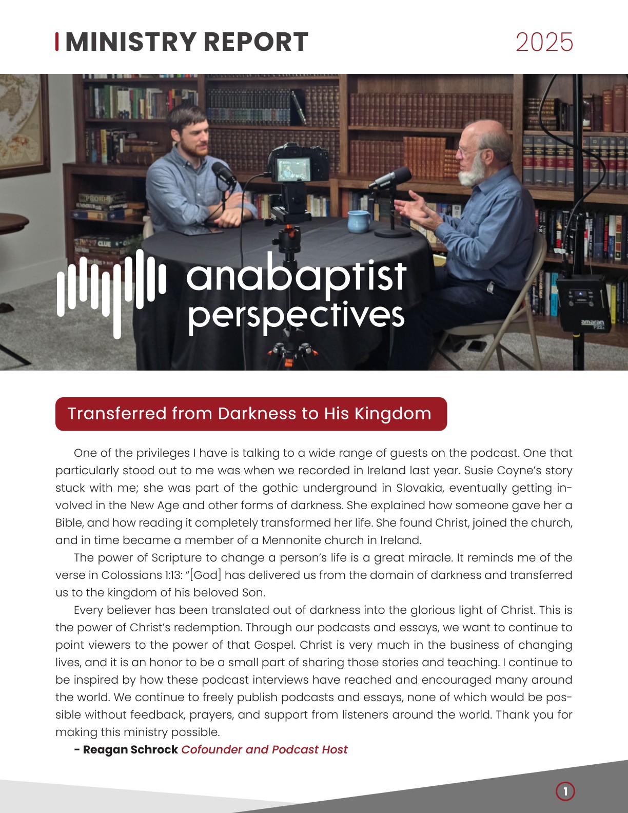 Read More →In this video, Jaran and Reagan, reflect on the beginnings of Anabaptist Perspectives, and what makes them excited about Anabaptist Perspectives today.